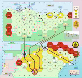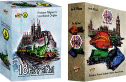 18ESP enthält eine 2-Spieler-Version. Diese kann mit dem Standardspielbrett gespielt werden. Da jedoch nur etwa zwei Drittel des Spielbretts benötigt werden, biete ich ein separates Spielbrett an. Der für die 2-Spieler-Version benötigte Spielaufbau mit gelben Gleisplättchen ist vorgedruckt. Wie das Spielbrett des Basisspiels ist eine Seite auf Englisch und die andere auf Spanisch.